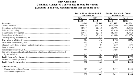 滴滴2025年第三季营收585.9亿,较上年同期的539.49亿增长8.6%;